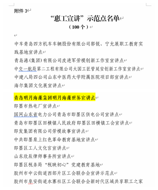 3月9日,從青島市總工會獲悉,青島明月海藻集團的“明月海藻世界”被評選為青島市職工思想政治教育實踐基地;“明月海藻世界宣講點”被評為青島市“惠工宣講”示范點。